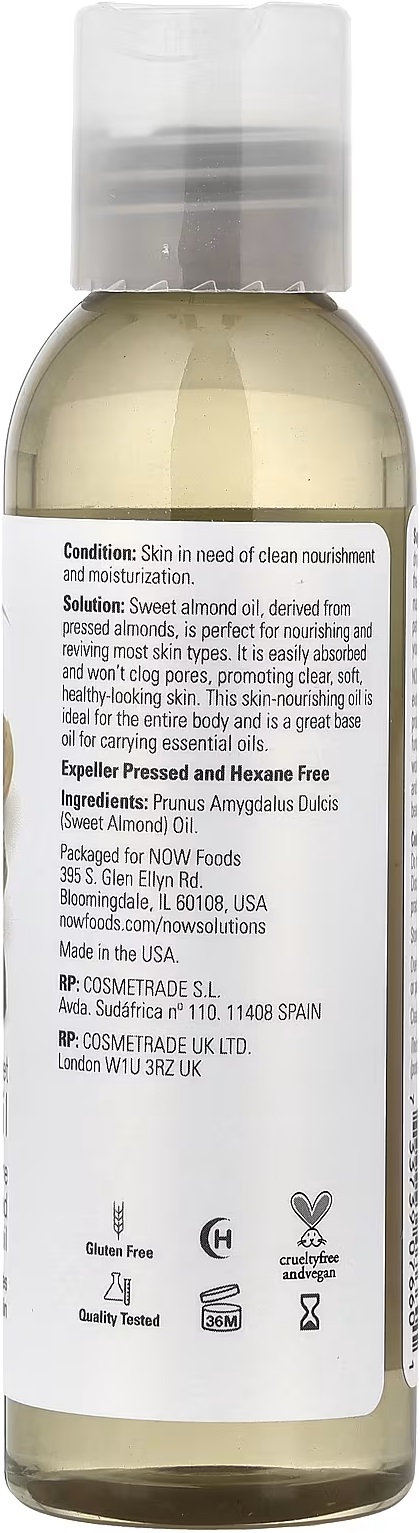 ● Solution: Sweet almond oil, derived from pressed almonds, is perfect for nourishing and reviving most skin types. It is easily absorbed and won't clog pores, promoting clear, soft, healthy-looking skin. This skin-nourishing oil is ideal for the entire body and is a great base oil for carrying essential oils.