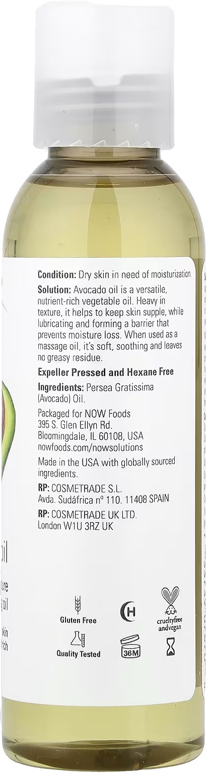 ● Solution: Avocado oil is a versatile, nutrient-rich vegetable oil. Heavy in texture, it helps to keep skin supple, while lubricating and forming a barrier that prevents moisture loss. When used as a massage oil, it's soft, soothing and leaves no greasy residue.